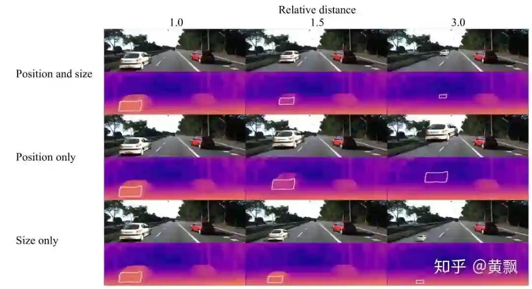 可以发现,尺度对于深度信息的预测没有什么影响,也就是说CNN网络是通过目标纵坐标来估计深度的,所以说网络实际上是在过拟合训练集,从中学习到一些固定场景下的深度和相对位置的对应关系。