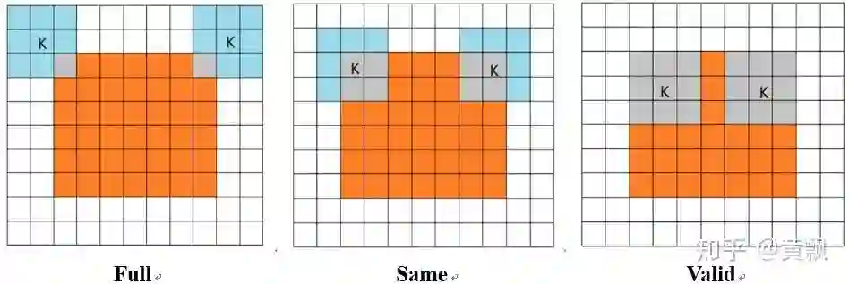 作者首先以三种卷积方式为例,full/same/valid,各自的区别在于padding的大小,具体方式我就不细说了,给个示意图: