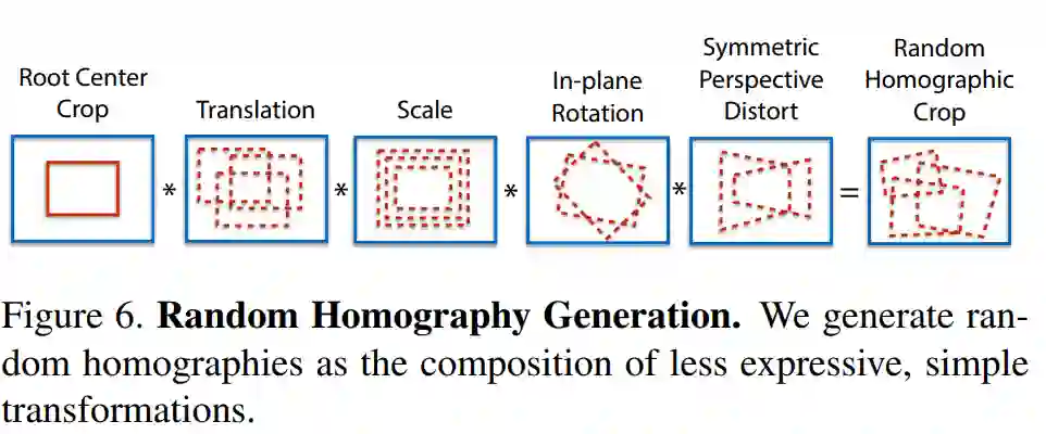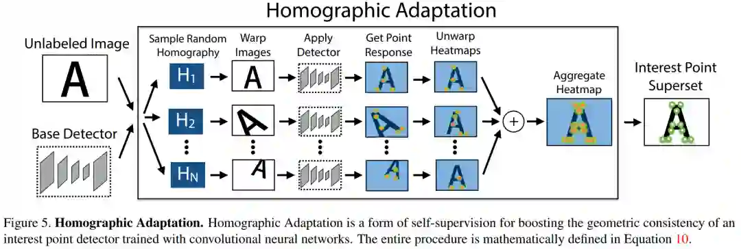 ,为了使网络的泛化能力更强,本文不仅使用原始了原始图片,而且对每张图片进行随机的旋转和缩放形成新的图片,新的图片也被用来进行识别。这一步其实就类似于训练里常用的数据增强。经过一系列的单映变换之后特征点的复检率以及普适性得以增强。值得注意的是,在实际训练时,这里采用了迭代使用单映变换的方式,例如使用优化后的特征点检测器重新进行单映变换进行训练,然后又可以得到更新后的检测器,如此迭代优化,这就是所谓的self-supervisd。