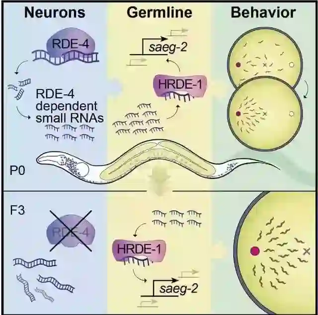研究人员还发现,需要在神经元中合成小RNA,蠕虫才能有效地被其必需营养素相关的气味所吸引,并顺利完成觅食活动。在父母一代的神经系统中产生的小RNA影响了这种行为,同时在三代之内影响了许多种系基因的表达。
