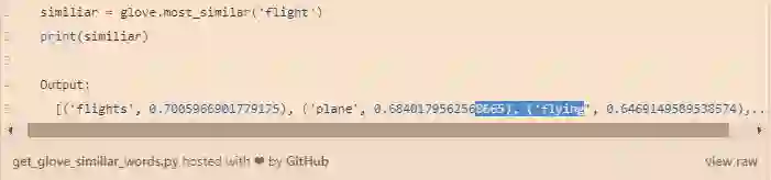 Glove和Word2vec都允许对相近词进行查找,这可以让我们对相近词结果进行比较。