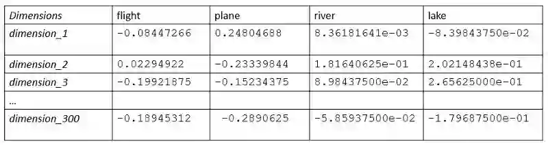 在单词表示系列的前一部分(第一部分)中,我讨论了关于不假设单词的语义(含义)和相似性的固定单词表示形式。在这一部分中,我将描述一个分布式单词表示方法家族。其主要思想是将单词表示为特征向量。向量中的每个条目代表单词含义中的一个隐藏特征。它们可以揭示语义或句法依赖性。在下面的示例中,我们看到300维的单词表示。我们可以到,“fight”和“plane”的向量值具有相似的值,且数值差异很小。同样,“river”和“lake”也有着密切的联系。