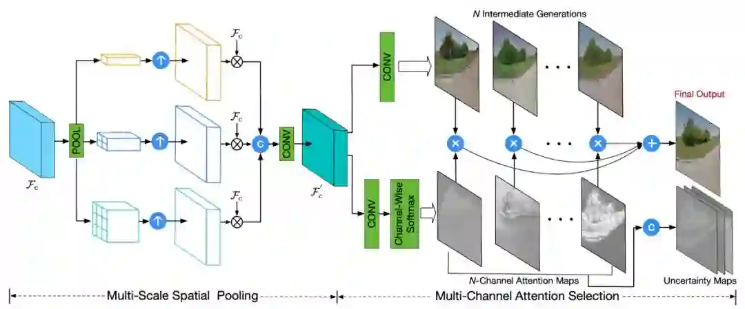 作者认为普通的三通道 RGB 图像所包含的信息太少,因此作者在多通道注意力选择中通过卷积网络扩大图像的通道表示,并且结合注意力映射产生更合理的结果,另外注意力映射还需要学习产生不确定映射用于引导优化由预训练模型所带来的像素级误差对整个模型的影响。