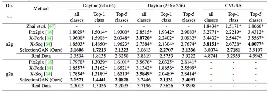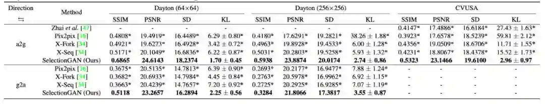 作者主要在 Dayton、CVUSA 以及 Ego2Top 数据集上进行实验,其基线模型选取了 Pix2Pix,X-Fork 以及 X-Seq 进行对比,评价指标采用了 SSIM,PSNR,SD 以及 KL 散度进行衡量,实验结果如下。