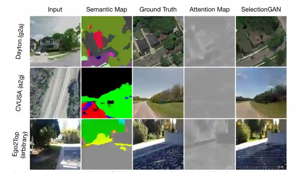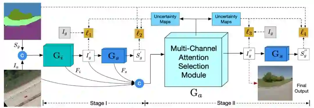 Selection GAN 旨在解决具有显著不同结构的图像翻译问题,其将翻译过程分为两个阶段,阶段一旨在捕获场景的语义结构,阶段二通过提出的多通道注意力选择模块关注更多外观细节。另外作者还提出了利用不确定性映射引导优化由预训练模型产生的语义图像素损失,以解决不准确的语义标签问题。在三个公共数据集的实验结果表明,该方法获得了比现有技术更好的结果。