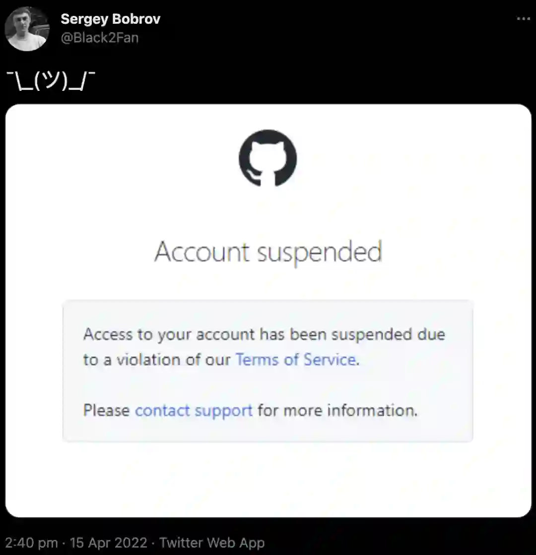 有开发者现身说法称,自己的账号先是被突然禁用,在照方抓药填表申诉后,又被GitHub放了出来。
