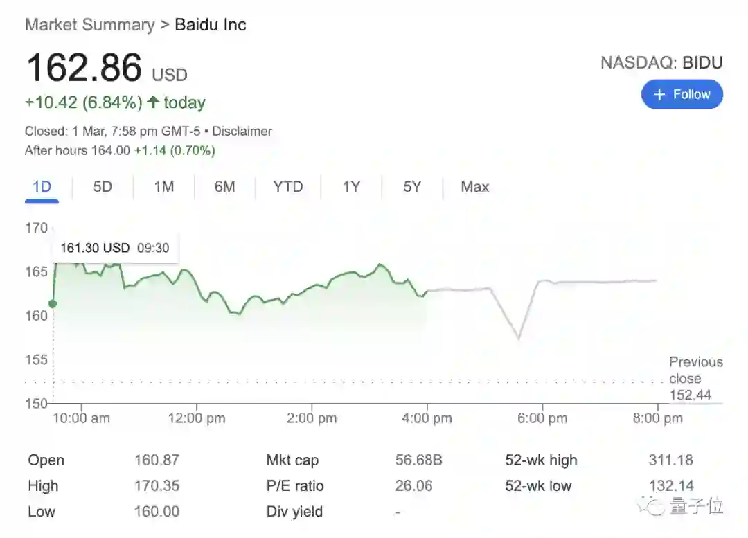 截至今晨收盘,百度股价收涨6.84%。