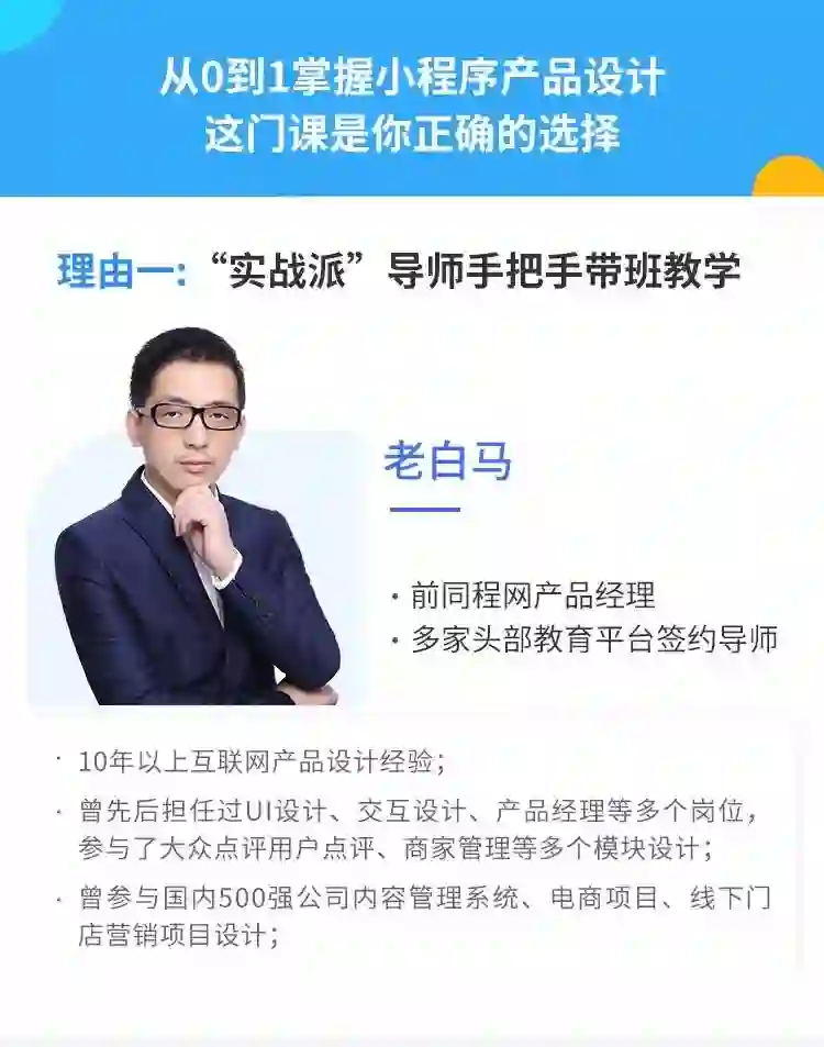 基于这些问题,起点学院联合业内资深产品老司机、前同程网产品经理@老白马,共同打造了《小程序产品设计入门与实战》学习计划,帮助大家全面系统地了解小程序,熟悉、掌握小程序产品设计要点。