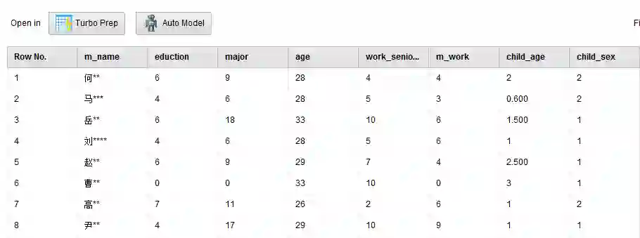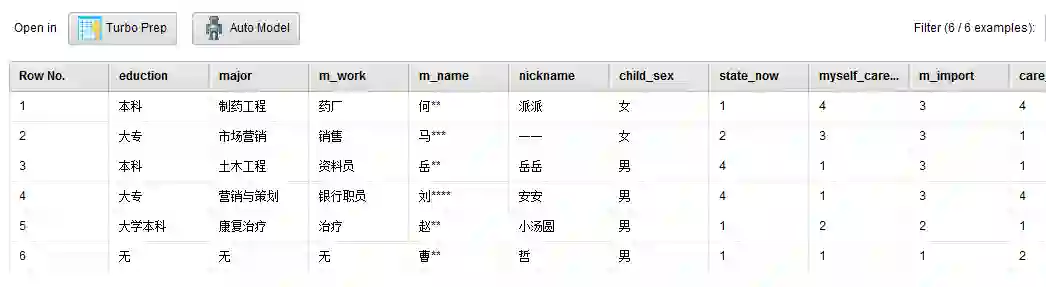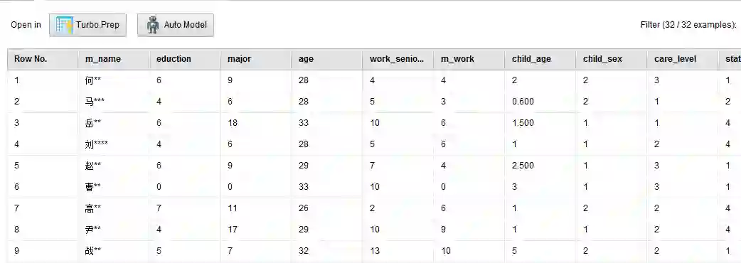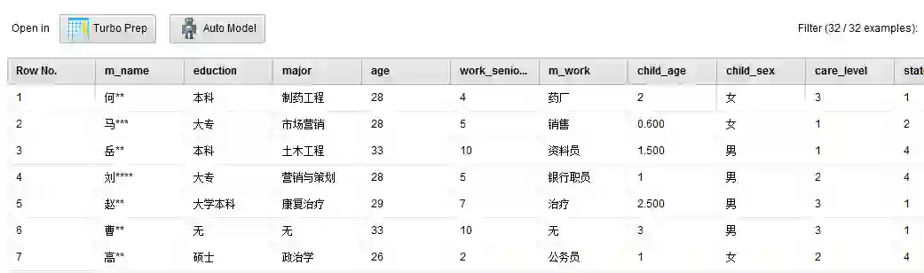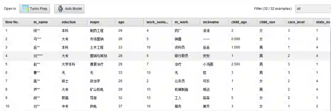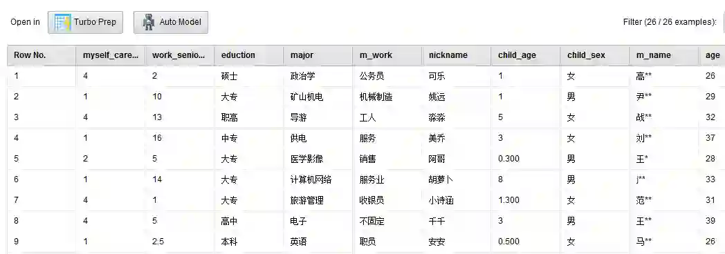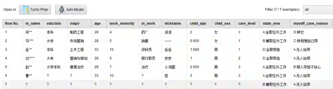 1.姓名(m_name):调查者的姓名。由于本篇文章会在公众平台上发表,对姓名我会做脱敏处理,只留下“姓”作为区分宝妈的依据,如:“吴军”会被展示成“吴**”。