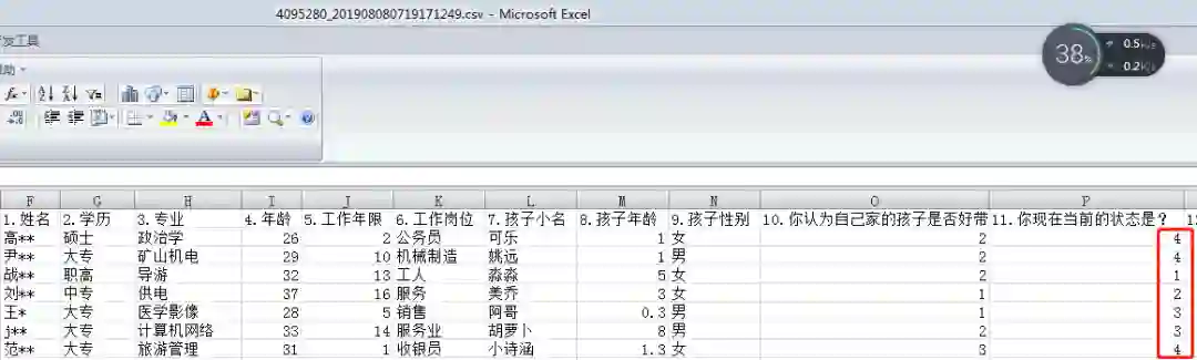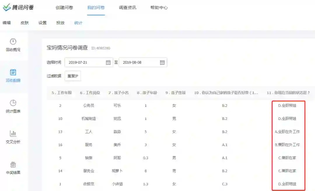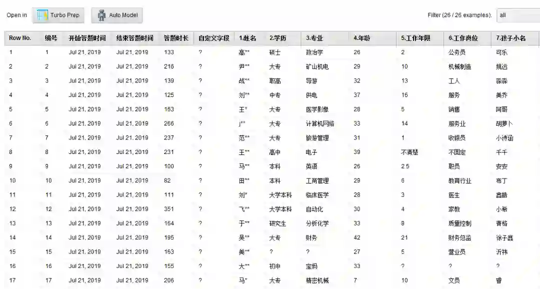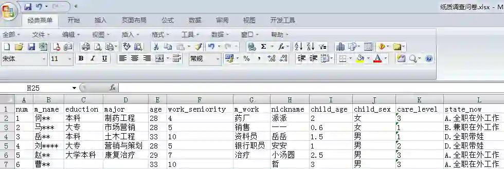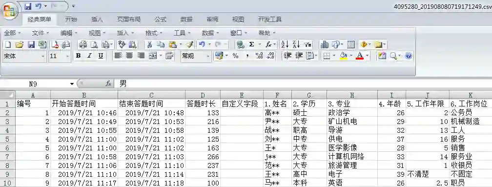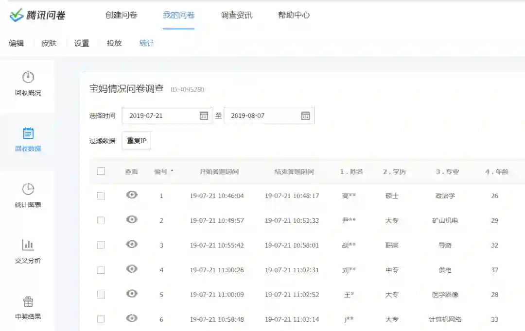 微信上进行收集的。如下是腾讯问卷调查的部分结果截图,姓名已做脱敏处理。