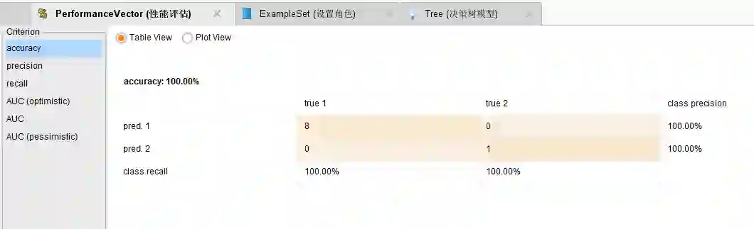 决策树评估结果”所示,决策树模型准确率是100%。