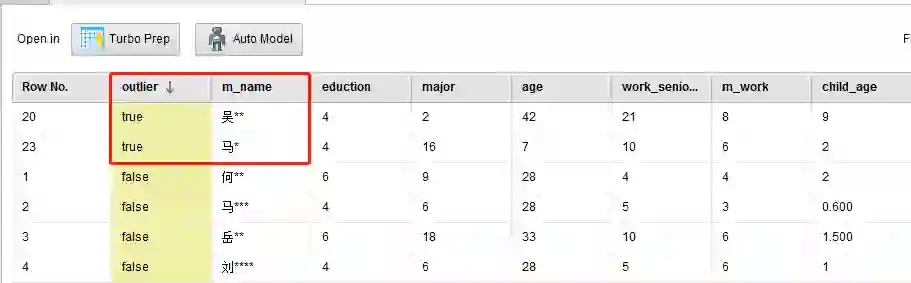(2)“离群点分析”的作用是找出数据表中的离群点,并标记出来。这里可以设置需要找多少个离群点,因为我们的样本数据比较少,所以笔者设置标记2个离群点数据。(Detect Outlier (Distances)控件)