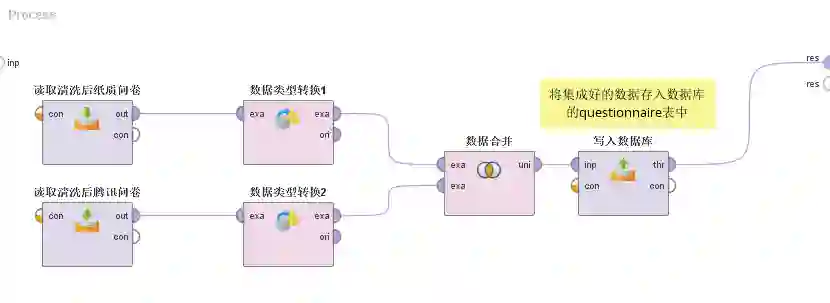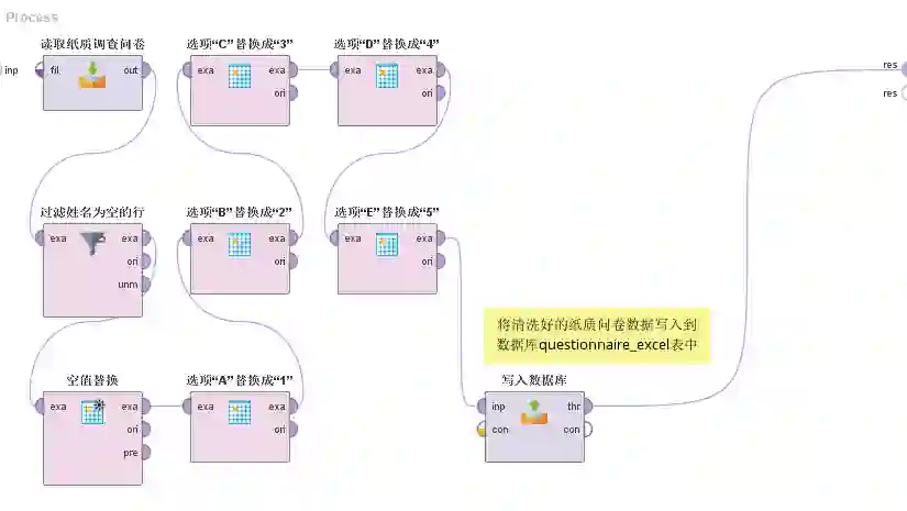 1.在Rapidminer中新建一个流程,名字叫“1纸质问卷数据清洗过程”。这个流程的主要目的就是对纸质调查问卷数据进行清洗工作。具体情况如下所示: