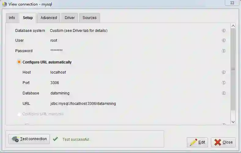 如下所示,我们在界面左侧的数据库连接处进行数据库连接的创建。并填写数据库信息,最后进行连接测试,当像图7一样显示“Test successful”时,说明已经配置好了。