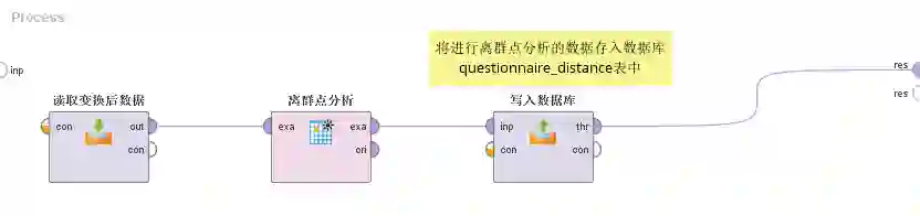 (1)“读取处理离群点后数据” 的作用是将流程“6处理离群点”(在数据库questionnaire_deal表中存放)的结果读取出来。