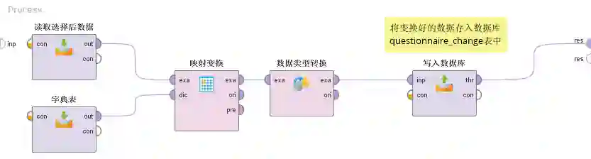 (1)“读取变换后数据”的作用是将流程“4数据变换”(在数据库questionnaire_change表中存放)的结果读取出来。(Read Database控件)
