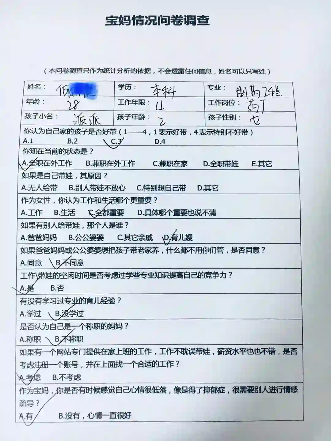 A.全职在外工作 B.兼职在外工作 C.兼职在家 D.全职带娃 E.其它