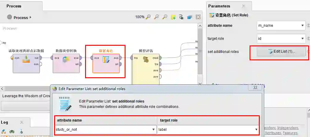 (3)“设置角色”的作用是将m_name(姓名)列的角色设置成ID唯一标识,并且将study_or_not(空闲时间是否学习)列设置成label标识(rapidminer中需要将预测列标识成label字段才可以执行流程)。(Set Role控件)