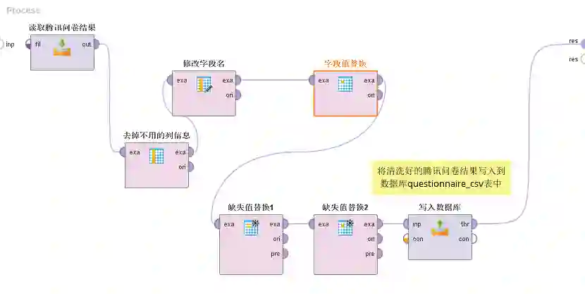 (5)“写入数据库”的作用是将清洗好的“纸质调查问卷.xlsx”数据存入数据库questionnaire_excel表中。(Write Database控件)