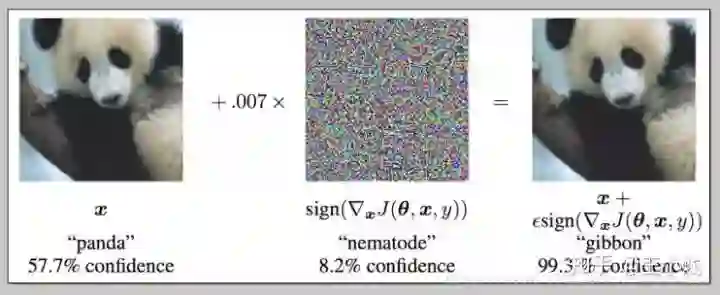 不可解释同样也意味着危险,事实上很多领域对深度学习模型应用的顾虑除了模型本身无法给出足够的信息之外,也有或多或少关于安全性的考虑。比如,下面一个非常经典的关于对抗样本的例子,对于一个CNN模型,在熊猫的图片中添加了一些噪声之后却以99.3%的概率被判定为长臂猿。