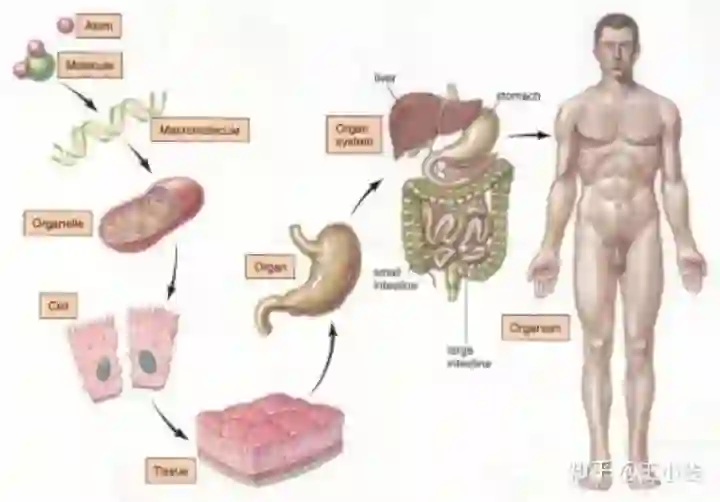 但实际上我们是知道这些参数的具体值以及整个训练过程的,所以神经网络模型本身其实并不是一个黑箱,其黑箱性在于我们没办法用人类可以理解的方式理解模型的具体含义和行为,而神经网络的一个非常好的性质在于神经元的分层组合形式,这让我们可以用物质组成的视角来理解神经网络的运作方式。比如如下图所示,人体的组成过程是从分子-细胞-组织-器官-系统-人体:
