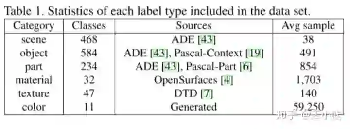 为了获得大量的视觉语义概念数据,研究人员收集了来自不同数据源的分层语义标注数据(包括颜色、材质、材料、部分、物体、场景这几个层次),如下图所示