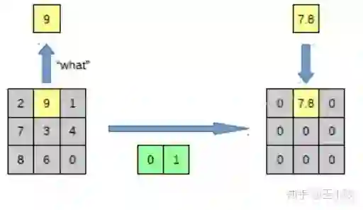 反池化其实很好理解,以下面的图片为例,左图可以表示是池化(pooling)过程,右图表示反池化(unpooling)过程,池化过程中我们将3*3的一个pooling块中的最大值取出,而反池化则是将pooling后的值恢复成3*3的像素单元,由于我们现在只有一个激活值, 所以只将该激活值对应原pooling块中位置的值还原回去,其他的值设定成0。所以在max-pooling的时候,我们不光要知道pooling值,同时也要记录下pooling值的对应位置,比如下图pooling值的位置就是(0,1)。
