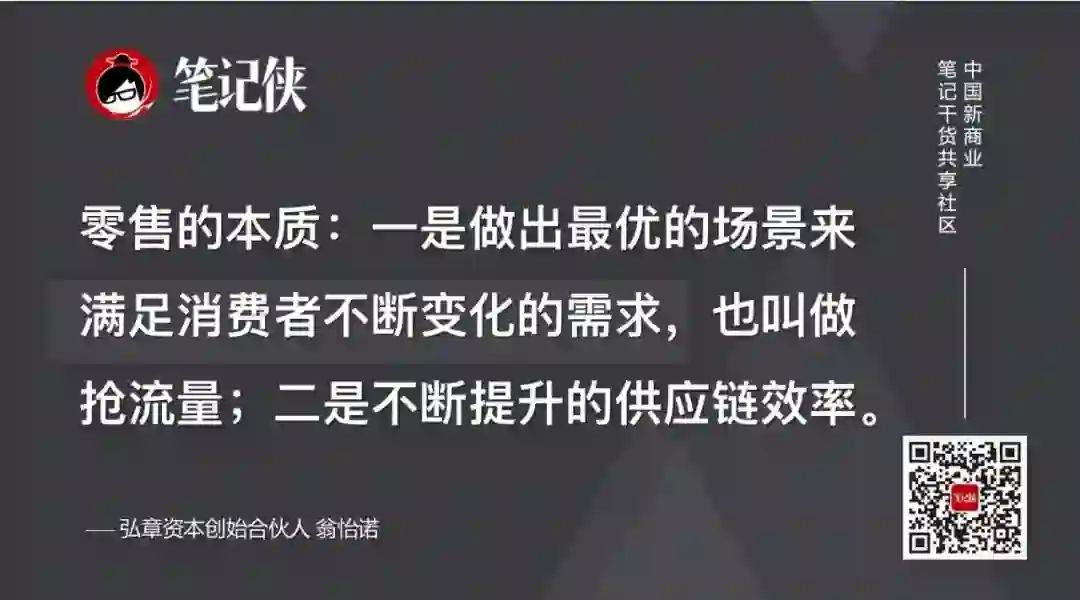 所以,从零售连锁经营的角度,到商业模式,到新零售很多新的业态的机会,本质上它的两个东西没有发生变化:一是用流量与场景来满足消费者的变化;二是不断提升供应链效率。
