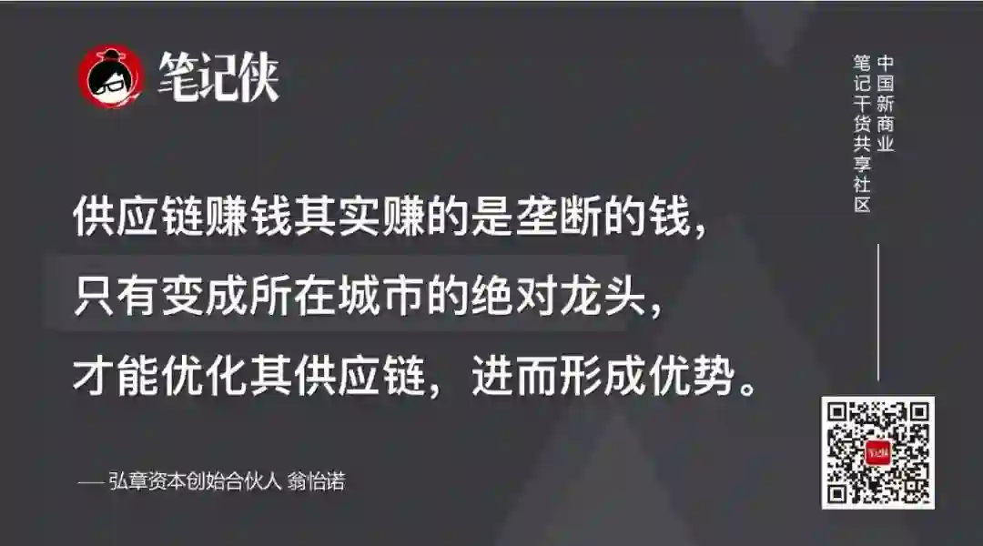 同一个区域流量的绝对垄断的争夺之战,供应链赚钱其实赚的是垄断的钱,只有变成所在城市的绝对龙头,才能优化其供应链,进而形成优势。
