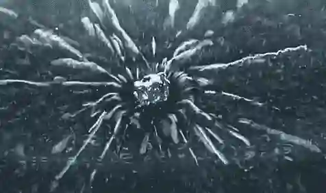 这是在云室中衰变的一小块铀矿石。云室是一种早期的粒子探测装置,云室中充满水蒸气(或醇类,更易蒸发),在底部放置制冷片以形成剧烈的温差,蒸气在下沉时形成过饱和蒸气。过饱和蒸气的温度已低于汽化点但仍为气态,故很不稳定,稍有扰动就凝结为液态。带电粒子在穿过云室时会电离它遇到的分子,产生的离子触发了过饱和蒸气的凝结,从而在云室中留下一条小液滴组成的径迹。