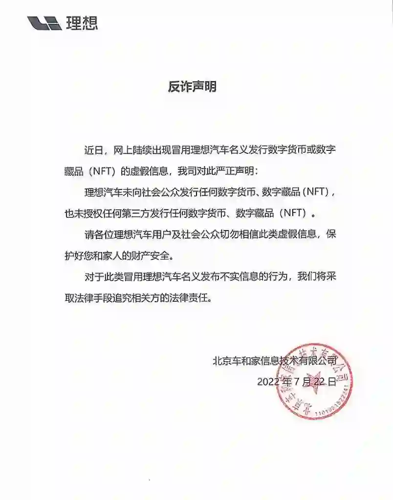 36氪获悉,理想汽车通过官微发布反诈声明称,理想汽车未向社会公众发行任何数字货币、数字藏品(NFT),也未授权任何第三方发行任何数字货币、数字藏品(NFT)。对于此类冒用理想汽车名义发布不实信息的行为,公司将采取法律手段追究相关方的法律责任。