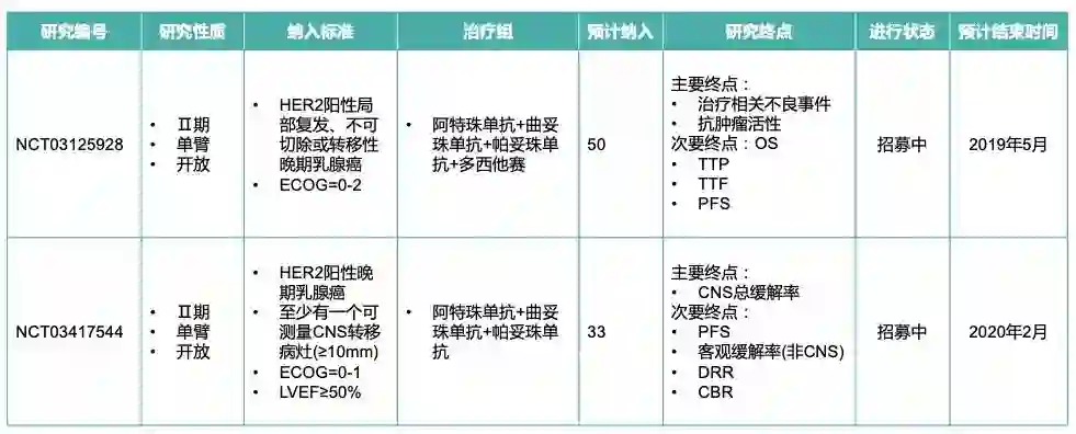表1 正在进行的atezolizumab+曲妥珠单抗/帕妥珠单抗的研究