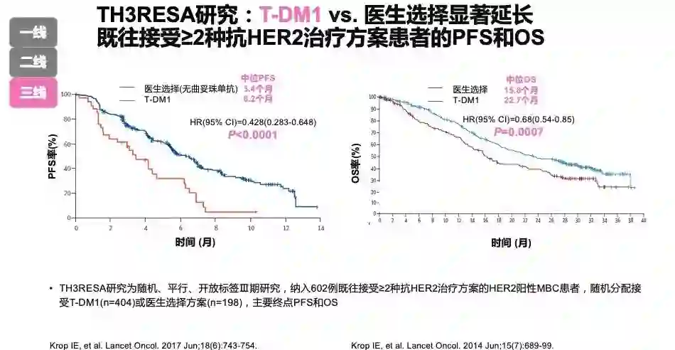 目前关于HER2阳性MBC的三线或以上治疗尚未标准方案。EGF104900研究证实,曲妥珠单抗治疗疾病进展后,持续使用曲妥珠单抗显著延长PFS和OS。TH3RESA研究证实,T-DM1相比于医生选择的方案,显著延长既往接受≥2种抗HER2治疗方案患者的PFS和OS(图3)。