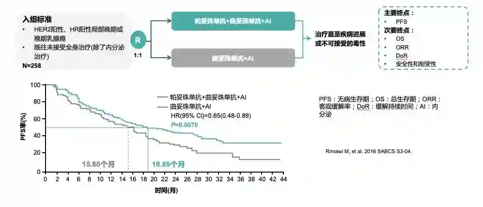 2. 不同人群:PERTAIN研究入组既往未接受全身治疗的HER2阳性、HR阳性局部晚期或晚期乳腺癌患者(图6),结果显示曲妥珠单抗+帕妥珠单抗联合芳香化酶抑制剂(AI)较曲妥珠单抗联合AI延长PFS(18.89个月 vs 15.8个月;HR=0.65,95%CI 0.48~0.89,P=0.0070)。而CLEOPATRA研究亚组分析则显示,无论HR状态如何均获益于曲妥珠单抗+帕妥珠单抗治疗方案。而对于老年患者,EORTC 75111-10114 Ⅱ期研究显示,HER2阳性晚期乳腺癌老年患者一线使用帕妥珠单抗+曲妥珠单抗的双靶方案联合节拍化疗,1年OS率分别为83.8%。而CLEOPATRA研究HER2阳性晚期乳腺癌老年亚组分析显示,曲妥珠单抗+帕妥珠单抗+化疗用于一线治疗优于曲妥珠单抗+安慰剂+化疗,显著降低复发风险50%,死亡风险降低47%。≥75岁患者临床获益倾向于帕妥珠单抗+曲妥珠单抗双靶治疗。