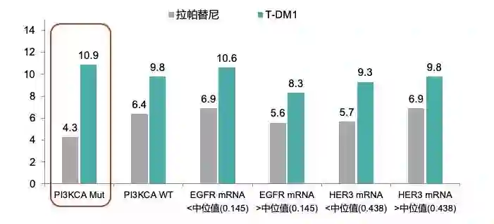 CLEOPATRA研究回顾性分析显示,肿瘤浸润淋巴细胞(TIL)>20%的患者接受帕妥珠单抗治疗的HER2+患者生存状况最佳(图9);EMILIA研究显示,T-DM1对PIK3CA突变的HER2阳性MBC治疗预后更好(图10),PIK3CA突变的患者对T-DM1敏感,而对拉帕替尼不敏感,T-DM1对PIK3CA突变的HER2阳性MBC治疗预后更好,且无论EGFR和HER3 mRNA表达惠普如何,T-DM1治疗HER2阳性MBC的PFS较拉帕替尼延长。