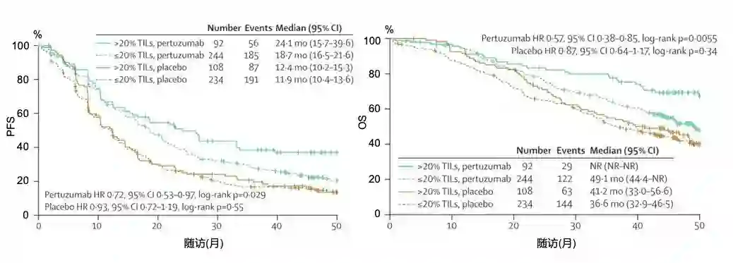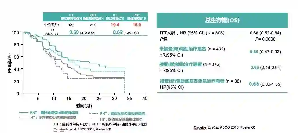 图5 CLEOPATRA研究亚组分析:无论既往是否接受过(新)辅助曲妥珠单抗治疗PFS、OS均显示相似的获益