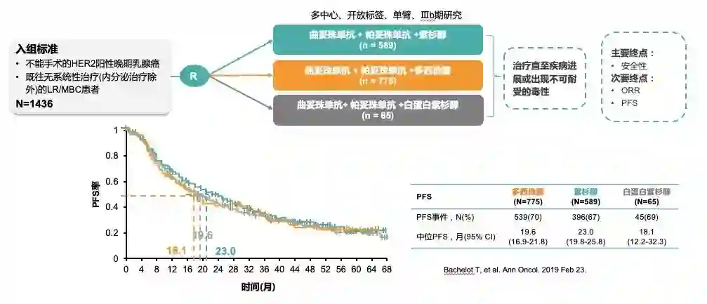 3. 联合不同化疗:PERUSE研究入组既往无系统性治疗且不能手术的HER2阳性局部晚期或晚期乳腺癌患者,对比曲妥珠单抗+帕妥珠单抗双靶方案联合紫杉醇、多西他赛和白蛋白结合型紫杉醇的疗效。结果显示三组患者中位PFS分别为23个月、19.6个月和18.1个月,无统计学差异(图7)。PERUSE研究证实,对于复发患者既往一线化疗方案,选择妥妥双靶联合不同化疗药物,适应不同患者用药需求。