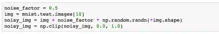 我们通过上面一个简单的例子来看一下如何加入噪声,我们获取一张图片的数据 img(大小为 784),在它的基础上加入噪声因子乘以随机数的结果,就会改变图片上的像素。接着,由于 MNIST 数据的每个像素数据都被处理成了 0-1 之间的数,所以我们通过 numpy.clip 对加入噪声的图片进行 clip 操作,保证每个像素数据还是在 0-1 之间。
