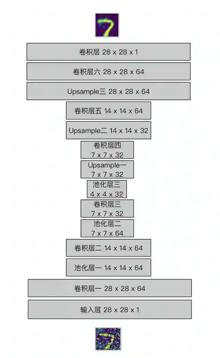 接下来我们就要开始进行 Decoder 端的卷积。在这之前,可能有小伙伴要问了,既然 Encoder 中都已经把图片卷成了 4 x 4 x 32,我们如果继续在 Decoder 进行卷积的话,那岂不是得到的数据 size 越来越小?所以,在 Decoder 端,我们并不是单纯进行卷积操作,而是使用了 Upsample(中文翻译可以为上采样)+ 卷积的组合。