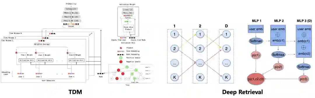 鉴于两段式解法存在的目标不一致、模型结构受限的问题,业界在技术迭代的过程中,也发展出了一段式的召回解决方案,其中代表性的工作为我们团队之前提出的 TDM 系列算法[7-9]和字节跳动提出的 Deep Retrieval 算法[10]。所谓的“一段式”,是相较两段式的价值度量模型训练、Topk 检索分开考虑而言,直接面向检索目标来同时学习索引结构和检索模型。这类方法一个比较大的特点是需要定义“参数化的索引结构”,并在训练中和模型进行同步优化。像 TDM 中的树结构、DR 中的多层编码结构,以及索引结构中虚拟节点的 embedding,都属于索引结构参数的一部分。此外,在 TDM、DR 中,item 与树的叶节点、与最底层编码节点之间的挂载关系映射函数,同样属于索引结构参数的一部分,是需要通过训练过程来优化的。正是由于索引结构与模型联合优化的模式存在,这类一段式解决方案通常不存在两阶段目标不一致的问题。同时,显式建模的检索过程往往能实现高效的候选集剪枝,所以可以使用计算力要求更高的复杂模型结构,而不局限于向量计算的模式。