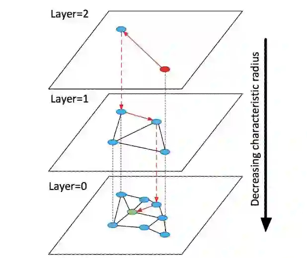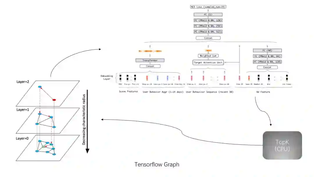因此,我们的目光转向了对模型和 item embedding 都没有任何约束的图检索。具体来说,我们选用检索精度较高的 HNSW 检索图[11]来根据所有候选项的 embedding 构建索引(构建算法见原始论文)。如下图所示,HNSW 检索图是一个层次化的图检索结构,第0层包含所有节点,上层节点为下层节点的随机采样,每层采样比固定(如32、64);每层都是一个近似 Delaunay 图 [12],图中每个节点都有节点与之相邻,且相邻节点距离相近(如欧式距离)。