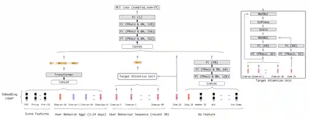 用户行为序列特征提取: 用户行为序列特征与目标 target 间采用了 target attention 的方式进行交互,以获取与目标 target 最相关的行为特征。该部分模型结构见下图右边,将序列特征中的 item 和 target 都通过 MLP 进行特征提取后,利用 Scaled Dot-Product Attention 得到最终用户行为序列特征。