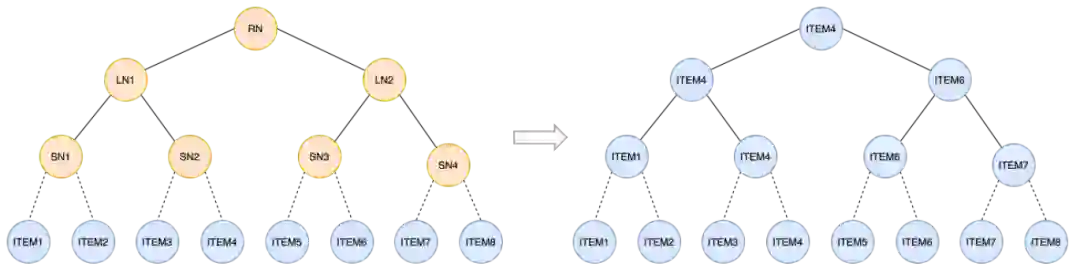 为了使模型训练不再依赖于索引,我们选择在模型训练后再构建没有任何虚拟节点的索引。一种很自然的想法是,将 TDM 树索引构建方式修改为通过层次 k-medoids 聚类的方式构建,其中叶节点依然为所有 item,但中间节点不再是虚拟节点,而是类簇的中心 item。但是,这种索引构建方式要求 item embedding 有层次化的类簇结构,实际上模型在训练时并没有加入相关约束,因此学出的 item embedding 并没有层次化类簇结构。从离线实验结果来看,这种索引构建方案的效果也比较差。