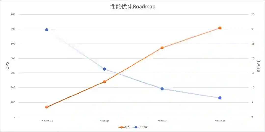 通过对 TF Raw Op 版本 profiling,发现最大的性能瓶颈是检索相关的 Op。因此,我们将检索过程归纳为了多种 Set Op,包括 set difference、set union等,并以 Tensorflow Custom Op 的形式实现了相关功能,保证检索与打分是在同一个 TF Graph 中完成。通过这种方式,将性能从 RT 39.8ms、QPS 68 提升至 RT 16ms、QPS 241,达到基本可用的状态。