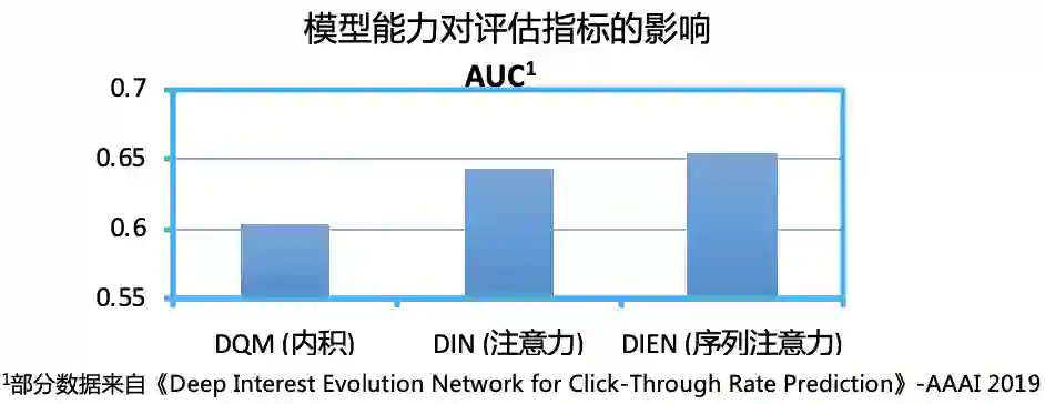 模型结构最终需要被设计成用户向量与 item 向量之间直接计算的模式,而这一要求对模型能力造成了较大的限制。事实上,如果不考虑检索模式对模型结构的要求,召回模型结构设计与后链路的一些模型如点击率、转化率预估模型等,可能并没有太本质的差异,但正是由于向量结构限制的存在,使得召回模型能力的天花板受到了较大限制。虽然目前还没有发现严格的证明与推导,能够论证向量结构到底在多大程度上影响了模型能力,但很多的实践结果都表明了这一限制切实存在且影响很大。下图中,我们给了一个简单的实验数据验证,来说明模型结构限制对模型能力的影响程度。不难发现,当结构从内积升级成带 target attention 的 DIN 结构后,模型精度有了一个大的提升。