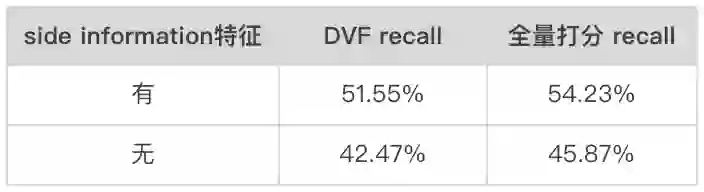 虽然 TDM 和 DR 等一段式解决方案的模型结构不再局限于内积形式,但由于索引和模型强耦合,且索引中存在虚拟中间节点,导致不易使用目标 item 侧的 side information 特征 。而在二向箔体系下,由于图索引对模型结构没有任何限制,因此可以很自然的加入 item 侧的 side information 特征。由上表可知,去掉 item 侧的 side information 特征后,全量打分 recall 和 DVF 检索 recall 都大幅下跌(绝对值约 9%),这一定程度体现出了二向箔算法体系相对于 TDM 和 DR 等一段式解决方案的优越性。