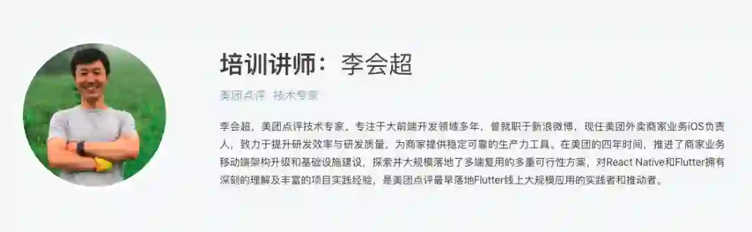 讲师简介: 李会超,美团点评技术专家。专注于大前端开发领域多年,曾就职于新浪微博,现任美团外卖商家业务 iOS 负责人,致力于提升研发效率与研发质量,为商家提供稳定可靠的生产力工具。在美团的四年时间,推进了商家业务移动端架构升级和基础设施建设,探索并大规模落地了多端复用的多重可行性方案,对 React Native 和 Flutter 拥有深刻的理解及丰富的项目实践经验,是美团点评最早落地 Flutter 线上大规模应用的实践者和推动者。