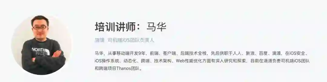 讲师简介:马华,从事移动端开发 9 年,前端、客户端、后端技术全栈,先后供职于人人、新浪、百度、滴滴,在 iOS 安全、iOS 操作系统、动态化、跨端、技术架构、Web 性能优化方面有深入研究和探索,目前在滴滴负责司机端 iOS 团队和跨端项目 Thanos 团队。