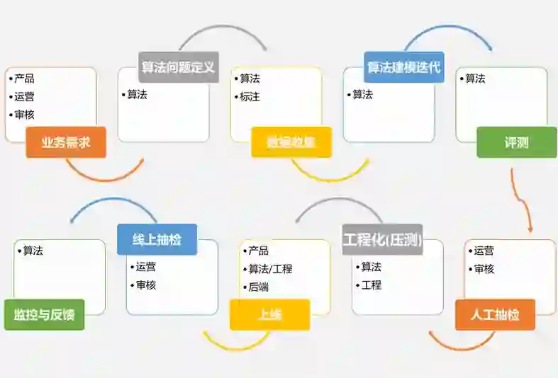 为了应对这些问题,我们构建了基于优酷智能视频分析平台的质量算法服务框架,目前已经为优酷短视频信息流产品部分场景提供机器过滤服务。我们遵循如下的算法工程化与上线流程,涉及到多个合作团队,其中多个环节可能需要多次反复迭代,才能进入下一个上线环节。