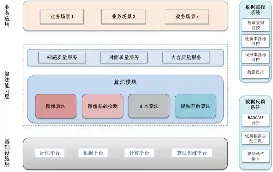 算法能力层:图像算法,图像基础检测,文本算法,视频理解算法以及对外提供的算法服务接口等;